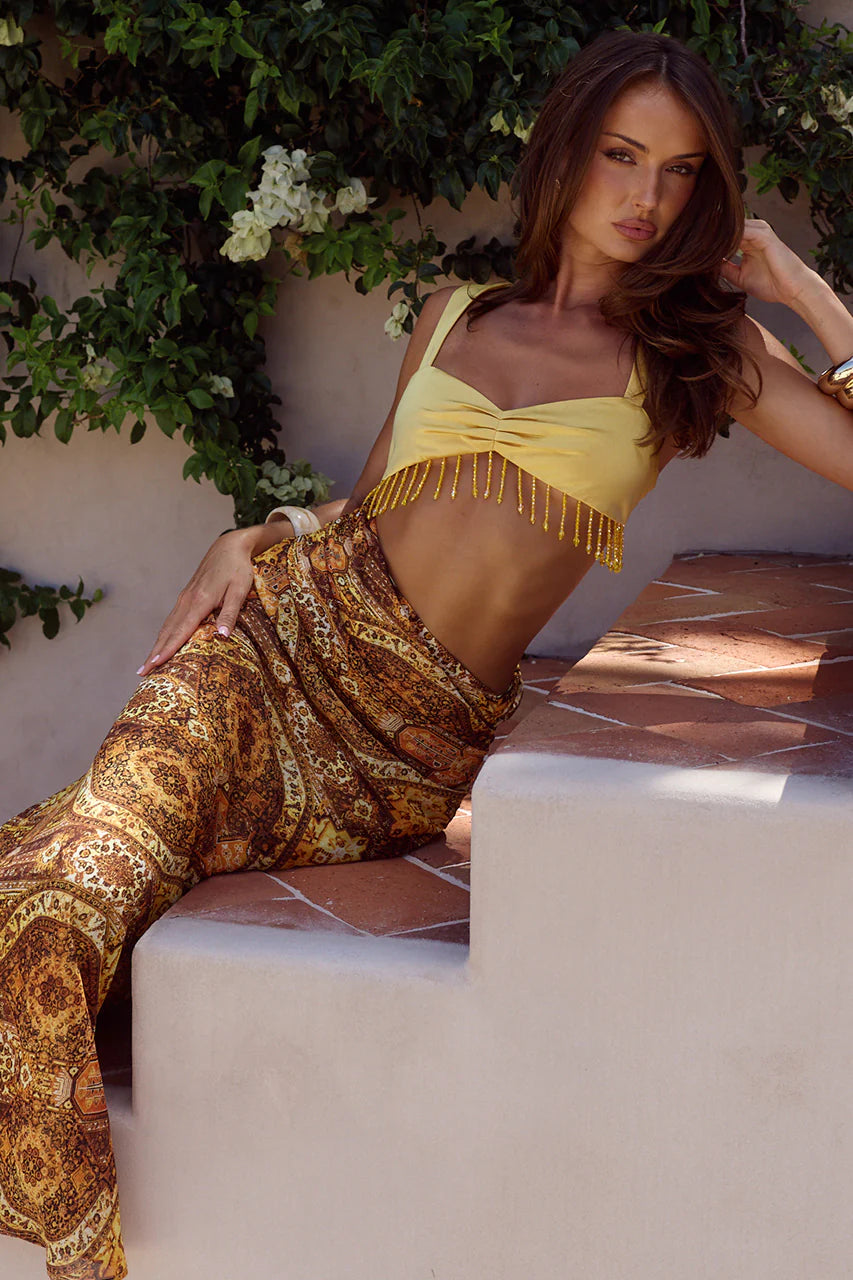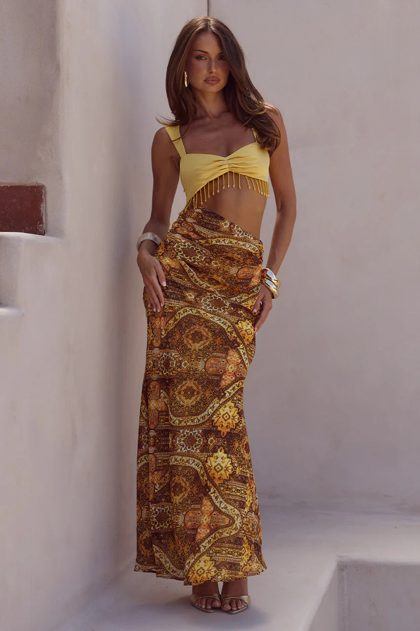 With a low waist cut out and under bust beaded trim in a rich gold print, our Alzona Maxi Dress is unique and feminine.