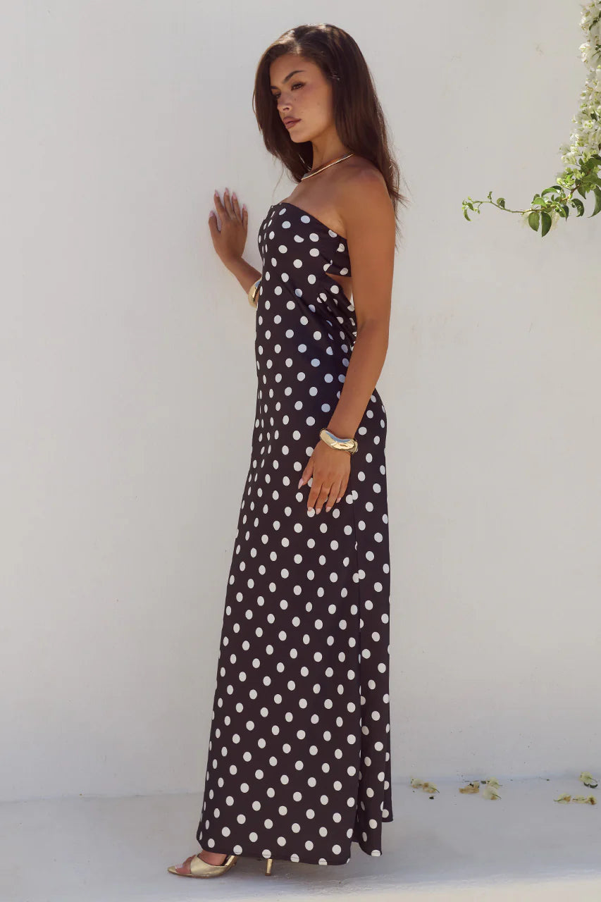 Our Celeste Maxi Dress is the picture of elegance, in timeless polka dots and simple silhouette, it’s the perfect piece for a wedding or evening event.