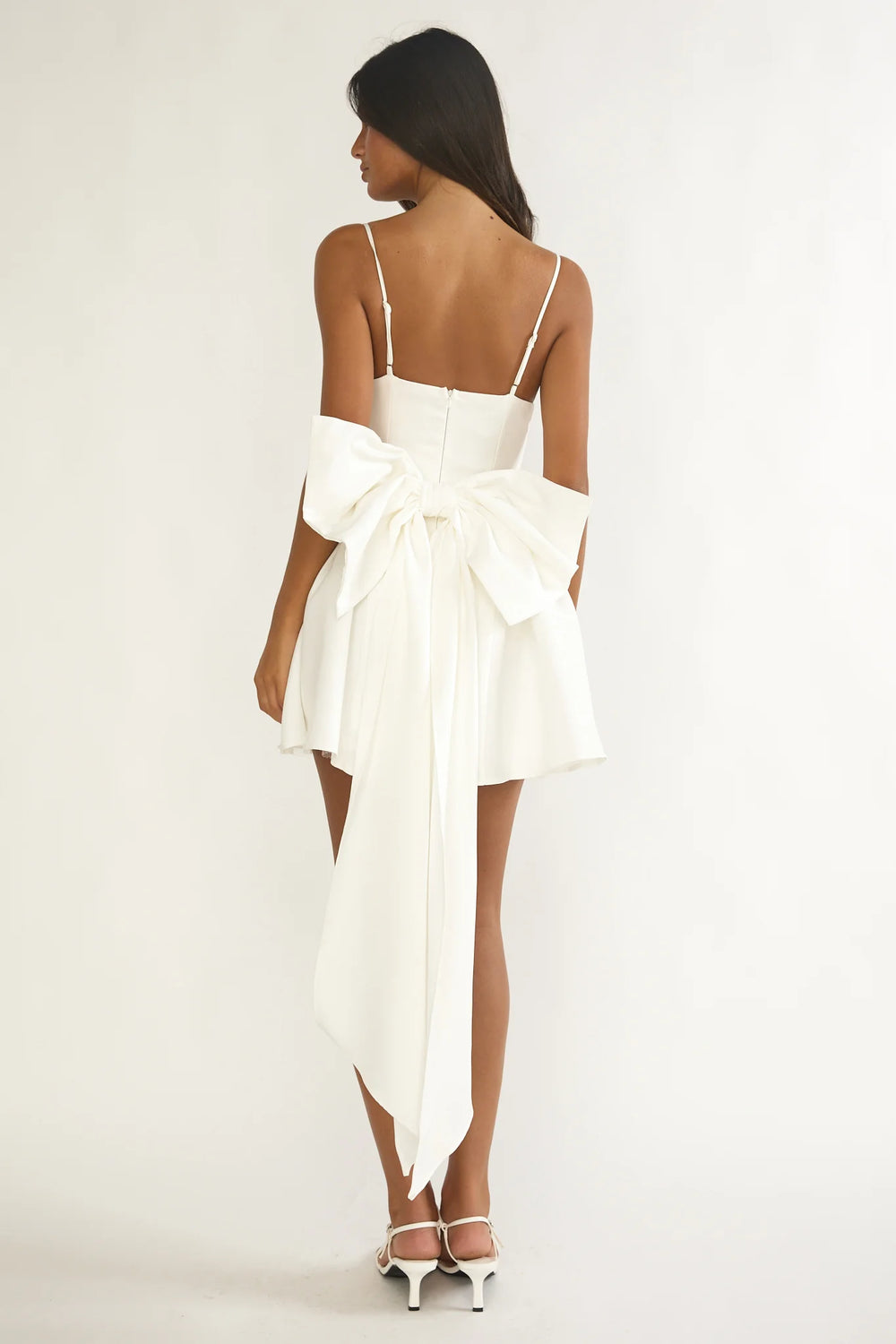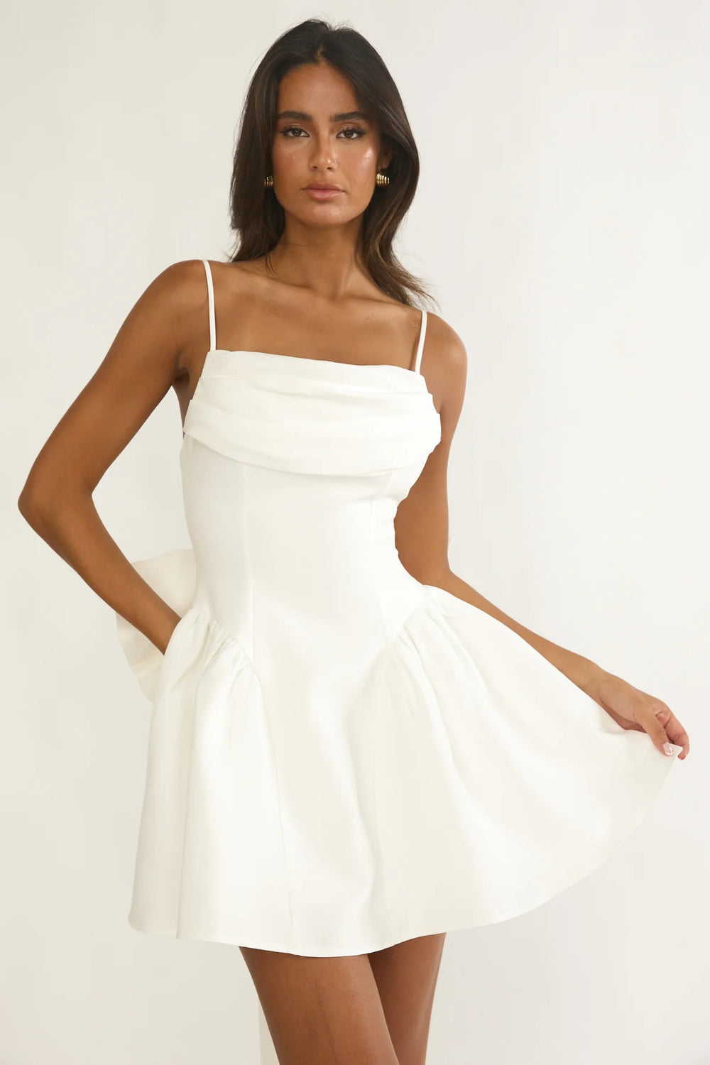 A crisp white mini dress features a structured, sleeveless bodice with a soft draped fold across the chest. It has a skirt that flares out playfully above the knees with a big bow detail on the back. 100%Polyester