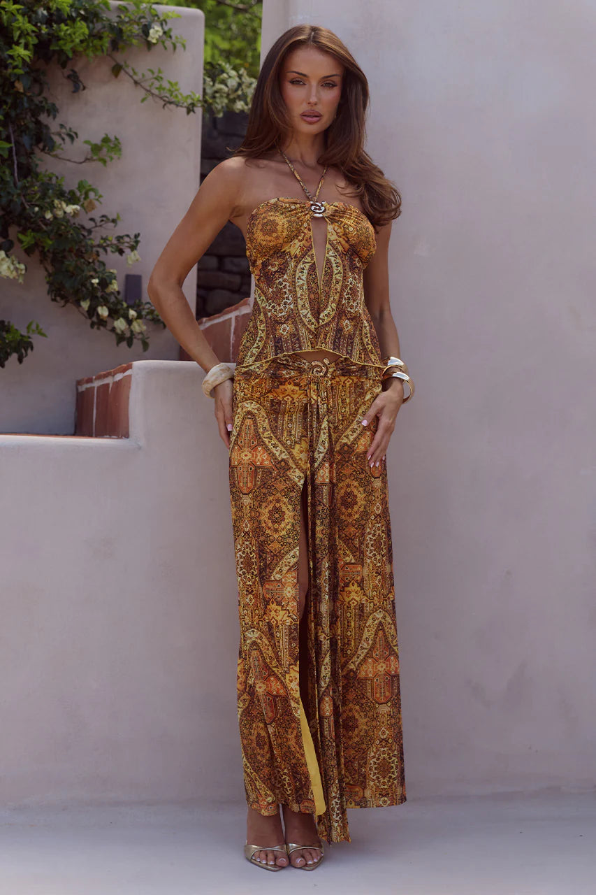 With a low waist cut out and under bust beaded trim in a rich gold print, our Alzona Maxi Dress is unique and feminine.